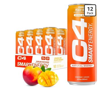 C4 Smart Energy Drink - Sugar Free Performance Fuel & Nootropic Brain Booster, Coffee Substitute or Alternative | Peach Mango Nectar 12 Oz - 12 Pack